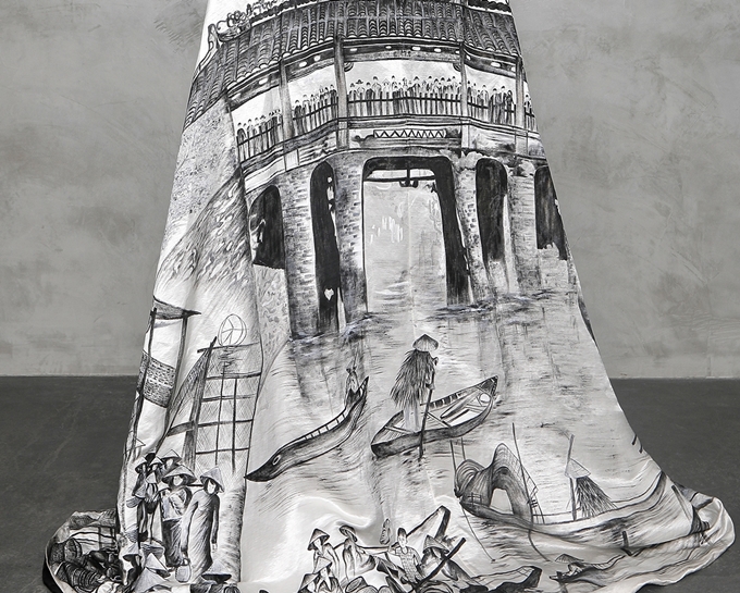 Hình ảnh chùa Cầu - một trong những biểu tượng văn hoá của thương cảng Hội An những năm 30 thế kỷ 20 cũng là một điểm nhấn khác của bộ áo dài. Trên chất liệu đũi thô dệt riêng cùng lối vẽ điêu khắc trên vải, hình ảnh nụ cười đôn hậu của cụ Xong và khung cảnh quen thuộc của phố cổ Hội An được tái hiện tinh tế.
